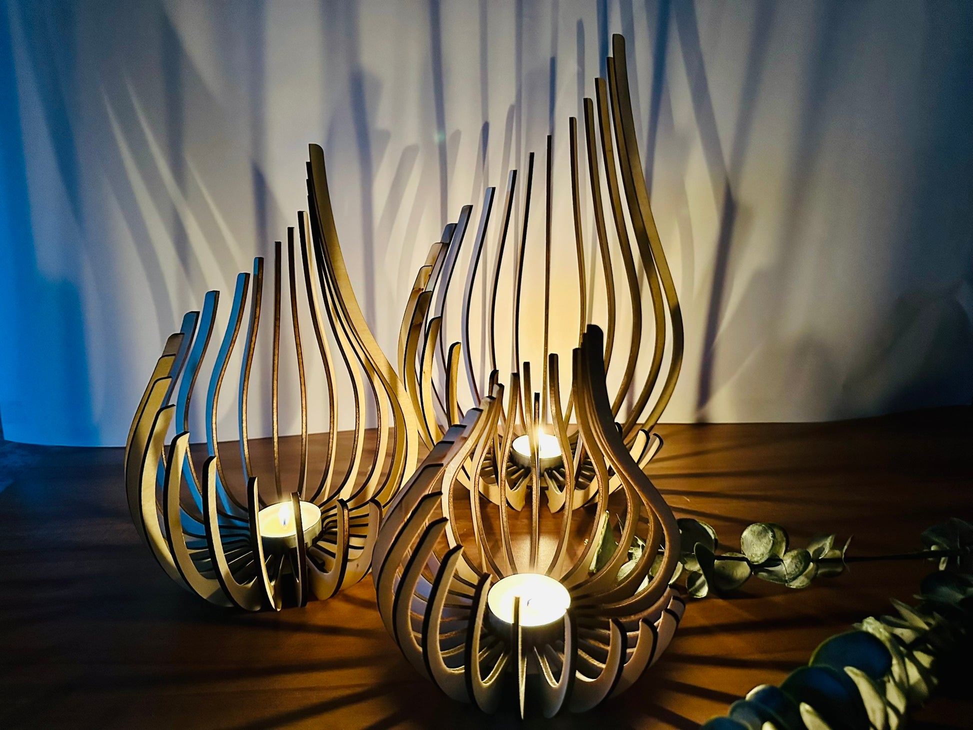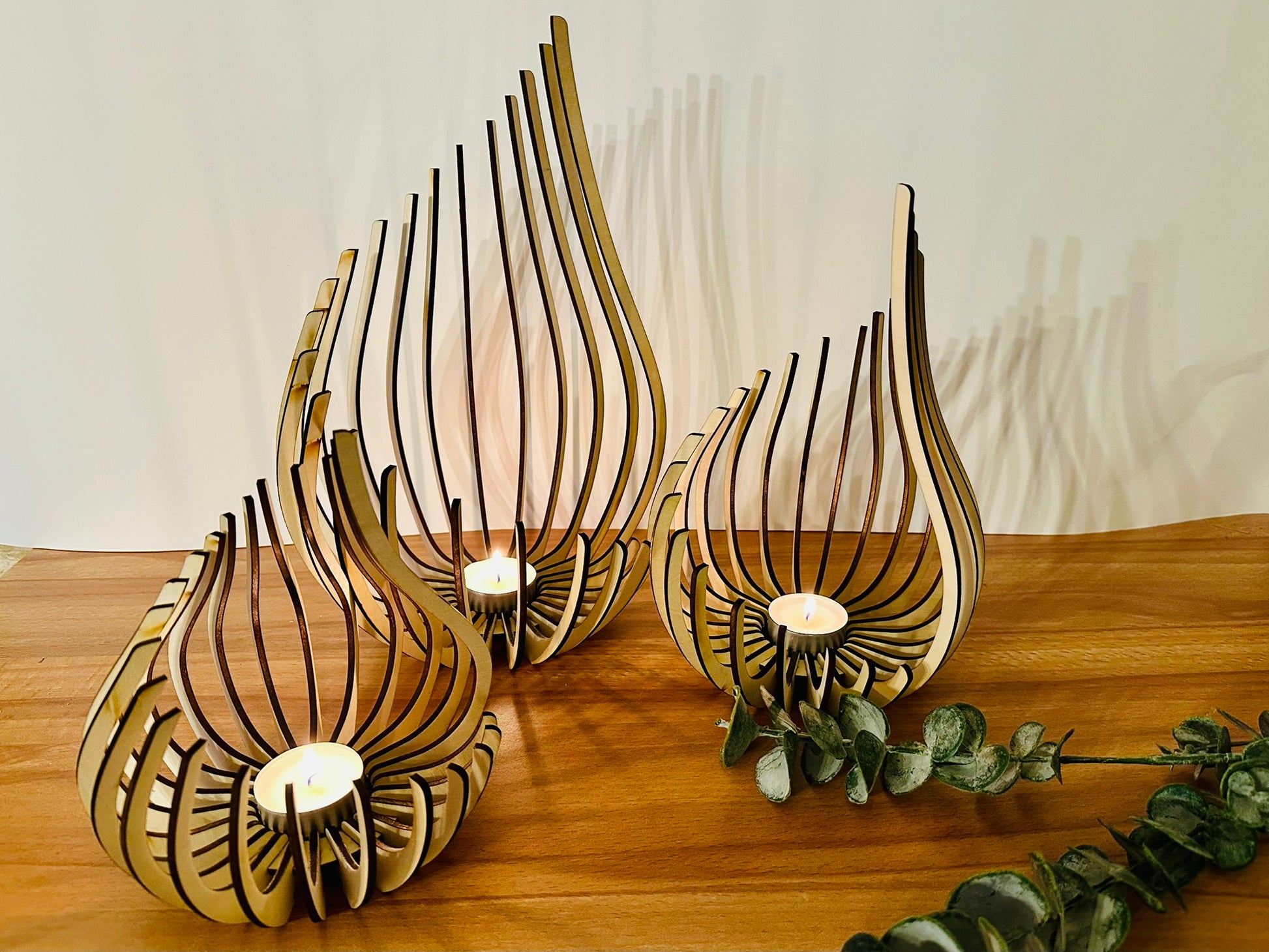 Diese wunderschönen Windlichter sind in drei verschiedenen Größen erhältlich, sie sind aus unbehandeltem Lindenholz gelasert.