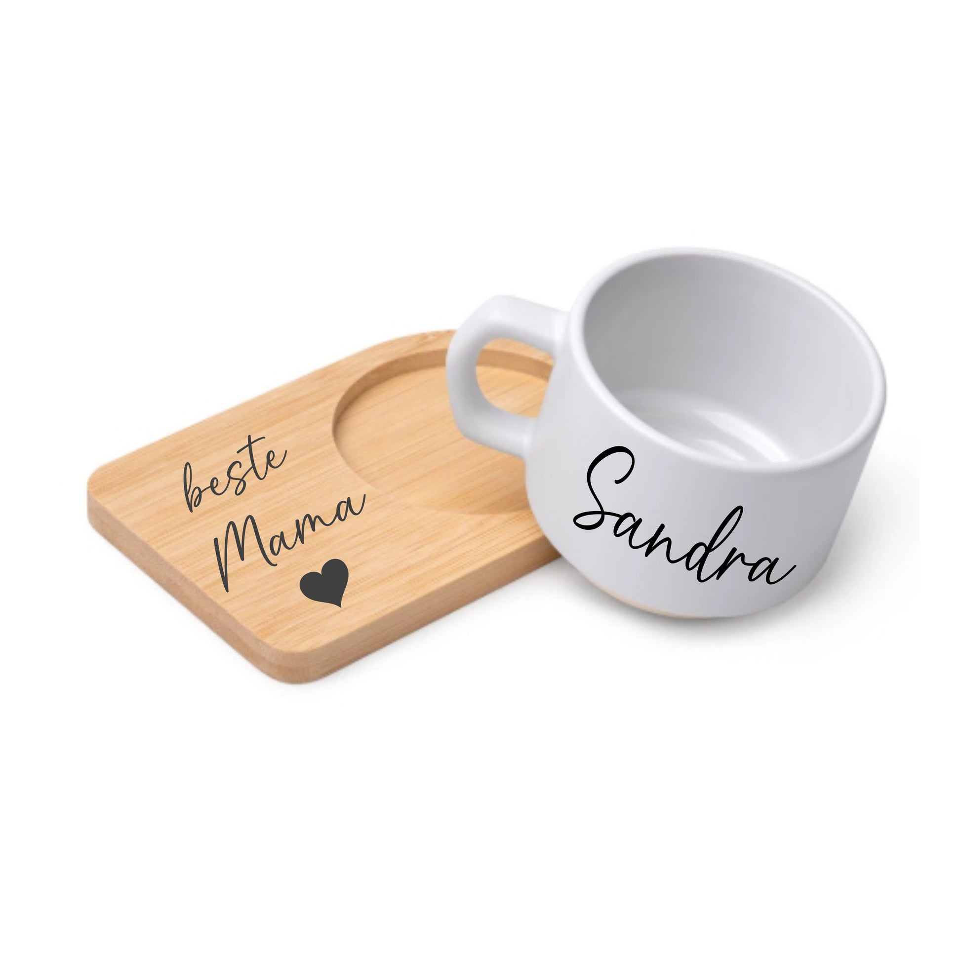 Kaffee- oder Teetasse zur Sublimation, die matte Oberfläche lässt die Tasse besonders edel erscheinen. Der Bambusuntersetzer lässt sich wunderbar mit einem Laser bearbeiten, kann aber auch mit UV-DTF oder Vinylfolie verziert werden.